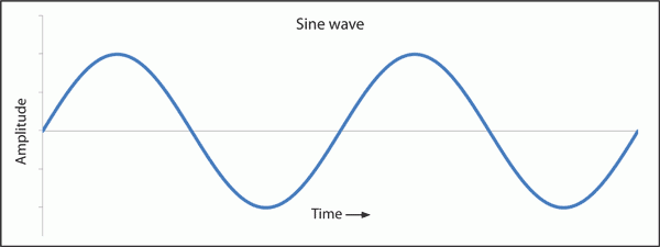 If we look at the sine wave below, which represents an audio signal, the y-axis (top to bottom) is amplitude, or volume, and the x-axis (left to right) is frequency, or time.