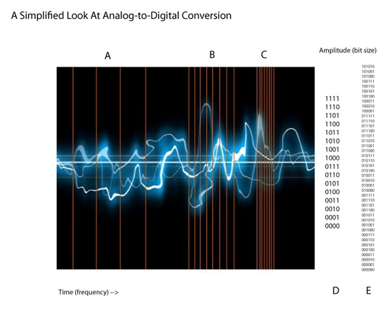 In today’s world these vibrations are captured digitally, allowing us to take whatever music we love, in whatever quantities we choose anywhere we go. Musical performances are now converted to a series of digital bits. From there it will remain a giant mass of organized 1's and 0's until you convert it back to analog to listen to it.