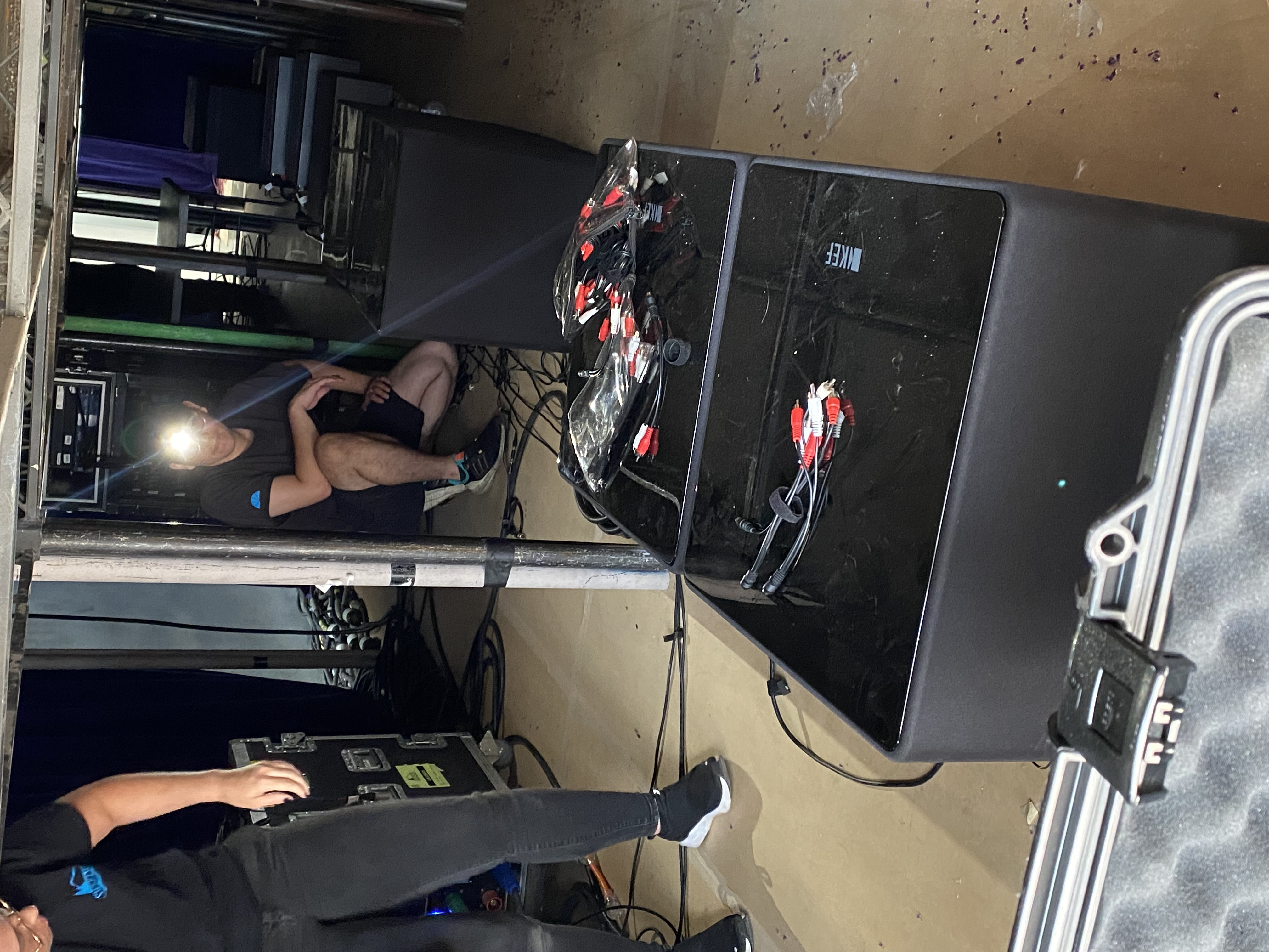 Installing the eight Kube 15 MIE subwoofers under the audience riser.